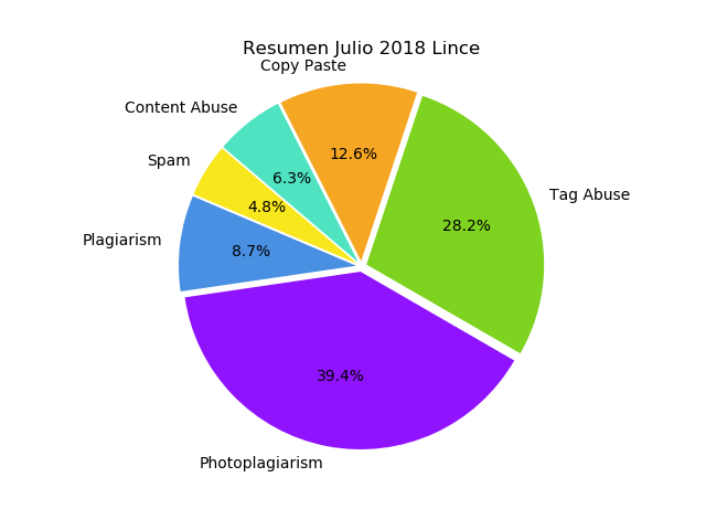 Julio es el primer mes del año que mantiene desde junio una proporción relativamente proporcional por cada incidencia. Aunque se encontraron en general menos publicaciones, si se continua así para Agosto, ya se podría concluir de forma general las incidencias de la comunidad hispana en steemit en un rank muy cercano a la realidad.