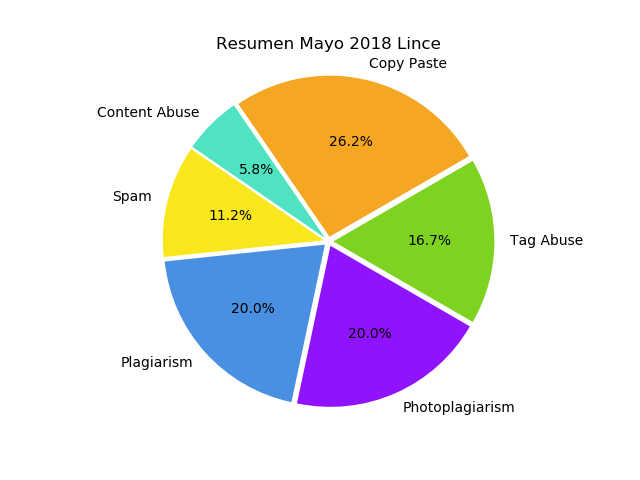 Para este mes de Mayo y a lo largo de lo que va de el año se nota un constante incremento en el Photoplagiarism, quizás se deba a el crecimiento de la comunidad hispana en Steemit y por lo tanto el número de "novatos" tiene una pendiente positiva; lo que explica que caigan en la clásica de no colocar fuentes a sus imágenes, esto encaja con el también constante incremento del típico Copy Paste. Por otro lado el Spam se mantiene a raya porque es la primera idea de usuarios que ya tienen algo de experiencia, pero que notan lo nada aceptable realizar esto en la comunidad.