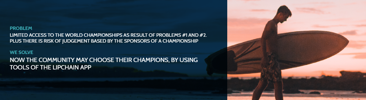 - Lack of funding for beginner to improve themselves up to professional level and high prices for surfing training can be solved by posting videos and photos at the LIPCHAIN network and by earning tokens.