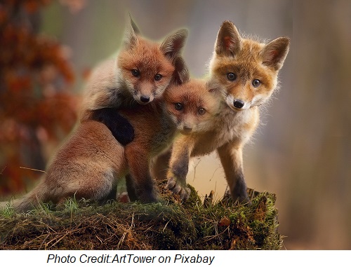 Then I wanted more life, so I went to Pixabay and found a few fox pictures. Finally I settled on one, a small fox peeking out of a burrow. The rest of the foxes were added as the collage evolved. These were also taken from Paint 3D. The GIF was constructed by using a GIMP application.