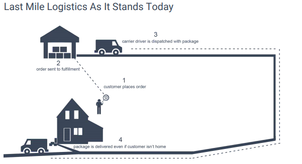 Давайте рассмотрим как происходит процесс оформления заказа и доставки покупки сегодня. Сначала пользователь размещает свой онлайн заказ. Он также имеет возможность выбрать скорость доставки, уровень безопасности и ее цену. Затем заказ направляется в центр исполнения заказов. На этом этапе, и мелкие, и крупные продавцы сталкивается с проблемой цены доставки, а также оценивания ее объемного веса. У маленьких продавцов чаще всего нету налаженной системы дистрибьюция, которая позволила бы предложить быструю доставку за более низкую цену. На следующем этапе извозчик получает пакет и он назначается за определенным водителем. На последнем этапе пакет доставляется водителем до пункта назначения.