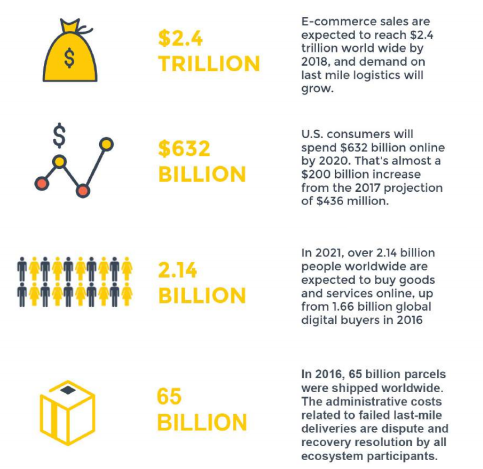 Статистические данные подтверждают стремительный рост сферы электронной коммерции. К концу 2018 года доход от продаж достигнет 2,4 триллионов долларов по всему миру. По оценкам, только американские потребители израсходуют 632 млрд долларов на онлайн покупки в 2020 году, что примерно на 200 млрд больше чем в 2017 году. Ожидается, что в 2021 году больше 2,14 миллиардов покупателей по всему миру будут совершать покупки товаров и услуг в интернете. Дальнейший рост сферы электронной коммерции требует развития сферы логистики. Для сравнения, в 2016 году 65 миллиардов посылок было доставлено по всему миру.