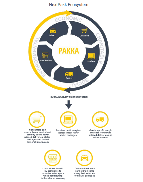 Процесс продажи ежедневно соединяет миллионы пользователей по всему миру друг с другом. Организация процесса доставки является неотъемлемой частью этого процесса. Новый проект NextPakk разработал платформу Pakka, которая соединяет в себе преимущества системы блокчейн и экономики совместного пользования. Характерным для экономики совместного пользования является то что, отдельные потребители, предприятия и агенты доставки участвуют в получении прибыли, а также несут ответственность за весь процесс.