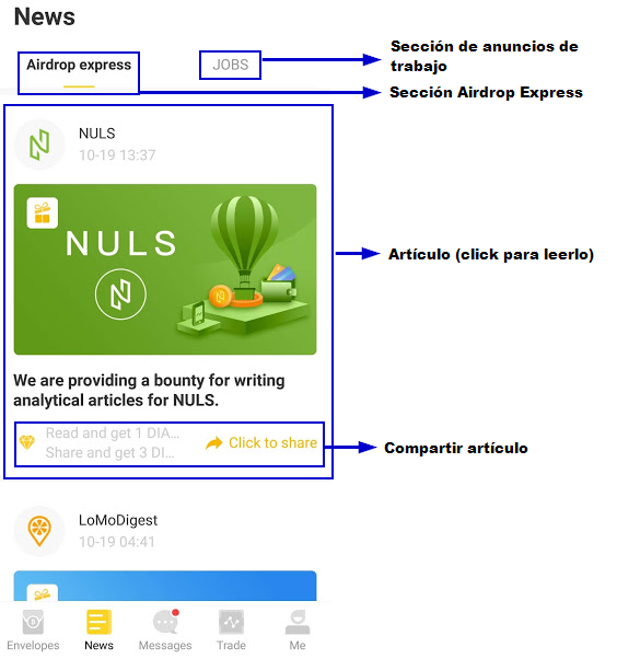 - Airdrop Express: donde podrás leer y compartir artículos sobre el mundo de las criptomonedas y recibir una recompensa por ello (diamantes o monedas).