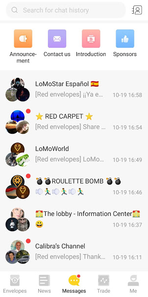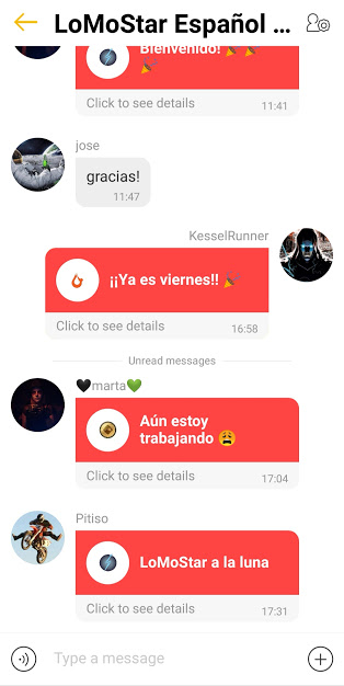 La comunicación es una pieza importante en LoMoStar. En la sección Messages, los usuarios pueden interactuar con otros usuarios por mensajes privados, en grupos e incluso enviarse y abrir sobres sin coste alguno (0 corazones)