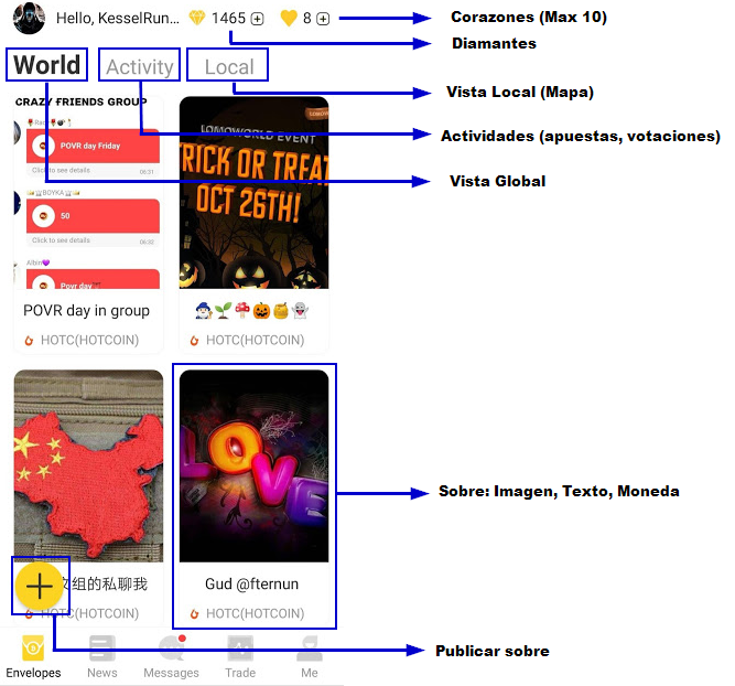 - Diamantes: Los diamantes sirven para publicar sobres en la vista global y local, anuncios de trading, regenerar corazones rápidamente y otras funciones. Los diamantes no se regeneran pero se pueden comprar con LoMoCoins o conseguir gratis compartiendo los artículos del apartado News (Noticias).