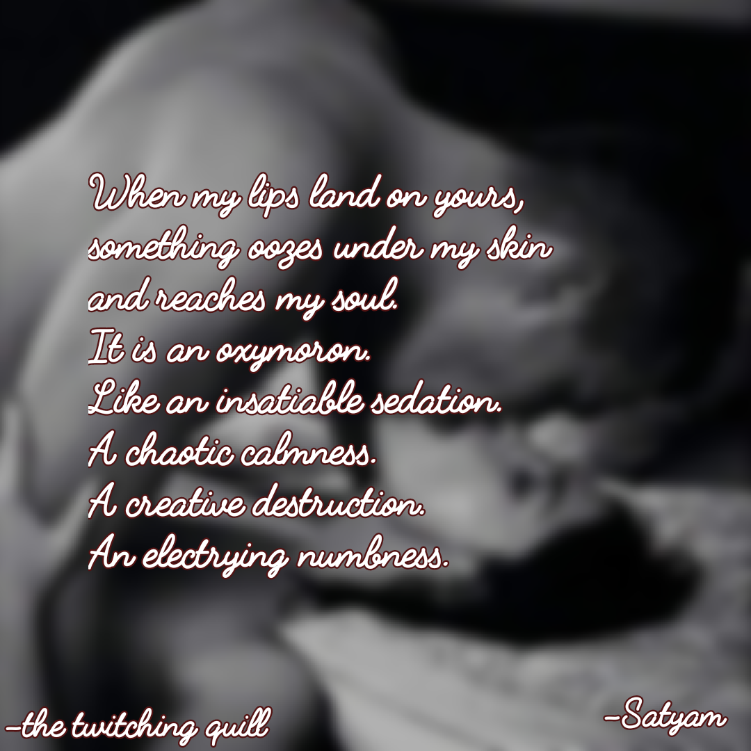 When my lips land on yours.dank.and.dead (25)in #love • 8 years ago When I touch you, it sparks everywhere in my body. All the follicles of my body stand in your reverence. Every touch is a bliss. It is an oxymoron; a blessing and a curse at the same time. #poetry #writings #steem #art