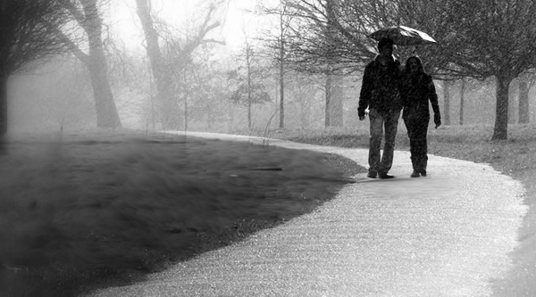 Phil did not say anything. Instead, he took my hand and led me to walk beside him on the sidewalk. We walked side by side through the rain shower under his umbrella, watching our own reflections in the puddles of rainwater as we walked. I asked him if we were heading to his car. He said no. I asked him how long had he stood there beside that street lamp. He said very long.