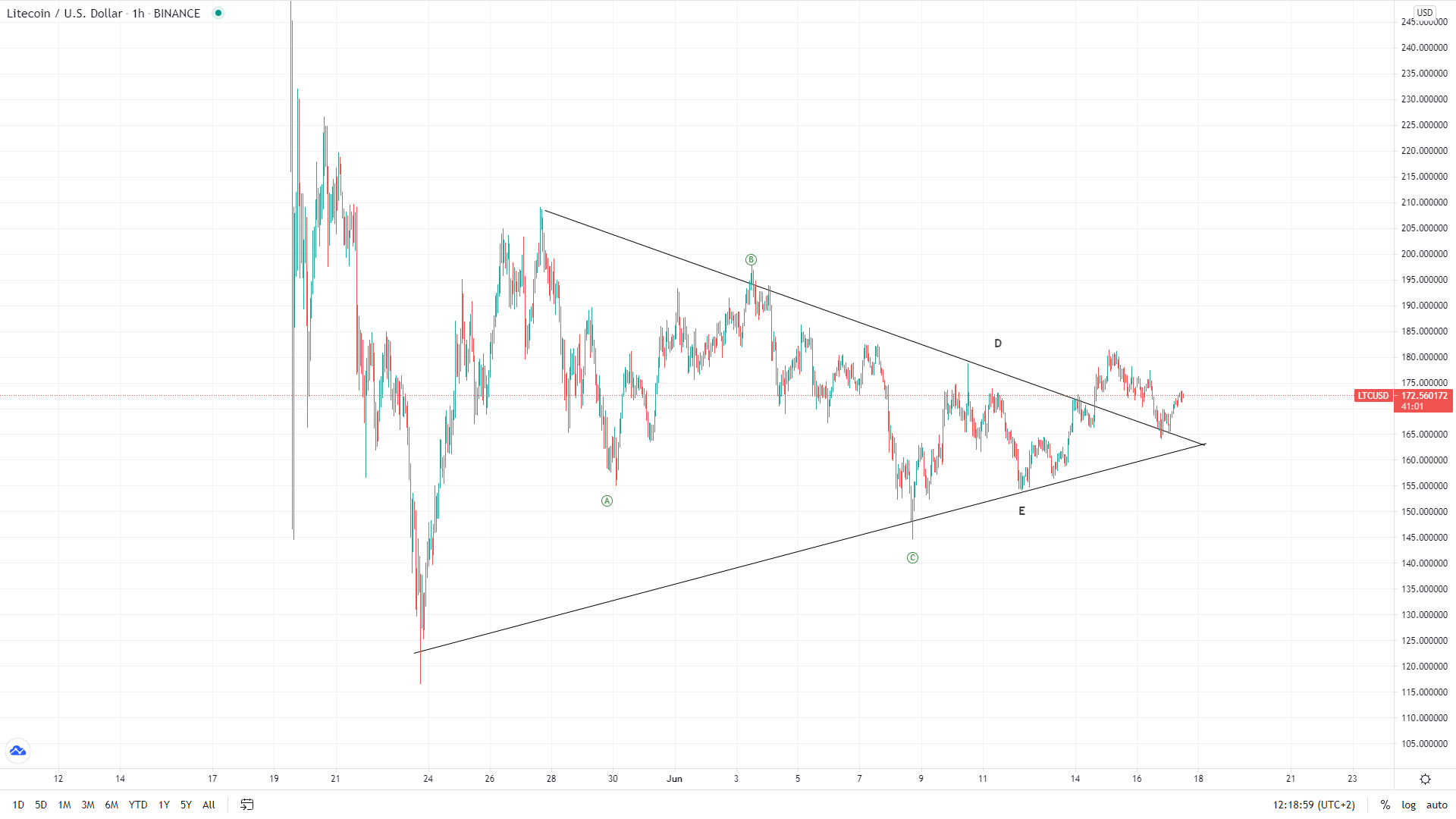 The price of Litecoin has been in recovery from the 8th of June when it fell to around $146 at its lowest point. From there the price went on to form a higher low and higher high to $180 area, breaking out from the symmetrical triangle in which it was since the 27th of May. Today we have seen a pullback as a retest of the prior resistance for support, and as support was present we have seen a bounce from there. Currently, the price is being traded at $172.5 area and is still moving in an upward trajectory.