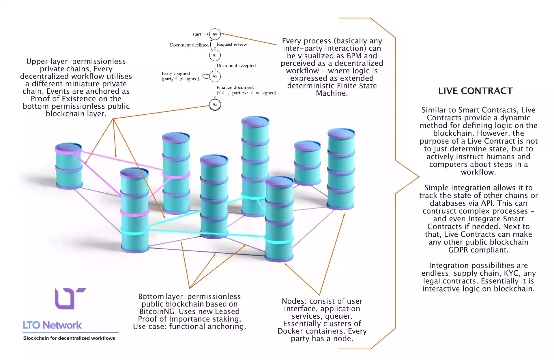 LTO Network-это гибридный блокчейн-этап для создания децентрализованных рабочих процессов, сохраняя при этом безопасность данных и согласованность GDPR. В LTO Network B2B включен для совместной работы на идентичном четности с помощью процесса без доверия. Эта стадия использует модель проверки важности и использует биткойнское утверждение. На этом этапе рабочая процедура передается как детерминированная Расширенная машина конечного состояния.