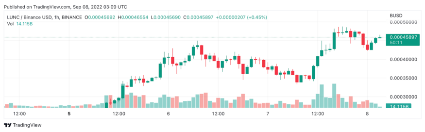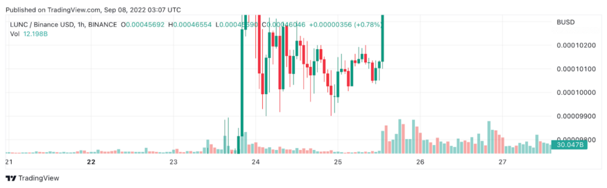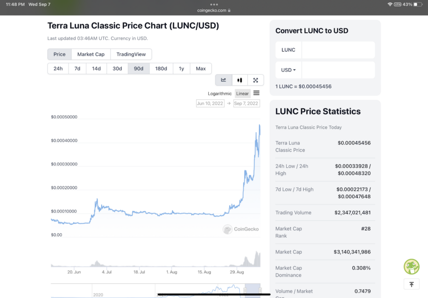 Luna Classic has been going parabolic during the past 14 days. The token has risen from a low price of about $0.00009905 on August 24th, all the way to $0.00048657 today, (September 7th). This is an astronomical gain of nearly 4,000% in just two weeks!