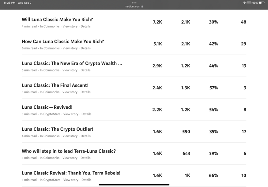 Since the beginning of August, I have written over eight articles covering the rise of Luna Classic on my Medium page. And the traffic on these articles have been nothing but estonishing. Some of these articles have had over 7.2k views and 2.1k reads.