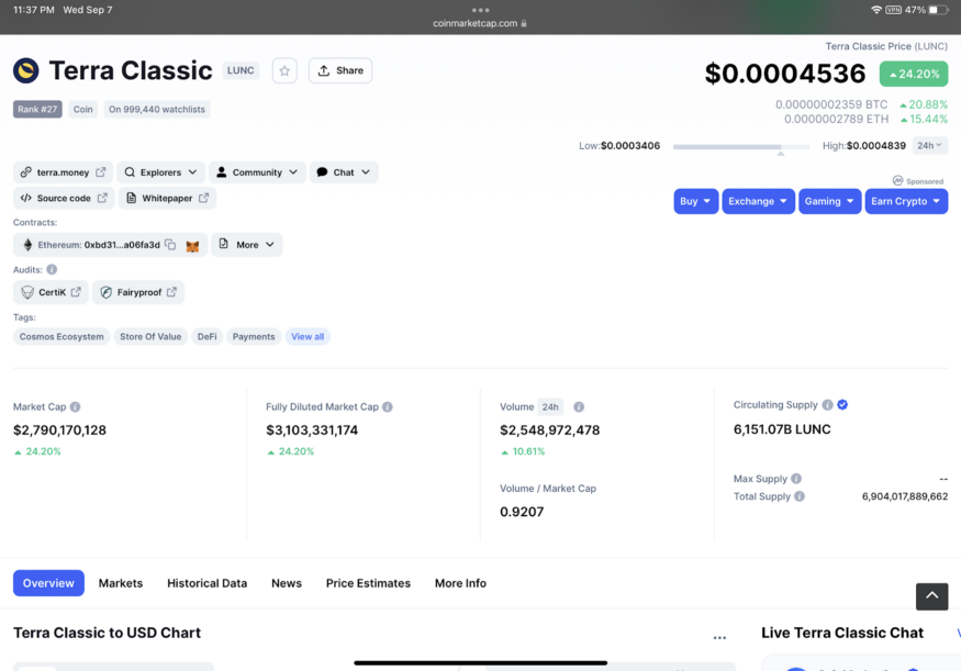 Consulting CoinMarketCap and Coingecko, we can see that Luna Classic just reached a market of $3.1 Billion on a 24-hour trading volume of $2.5 Billion. The token rose over 25% today and over 50% between September 4th and 5th.