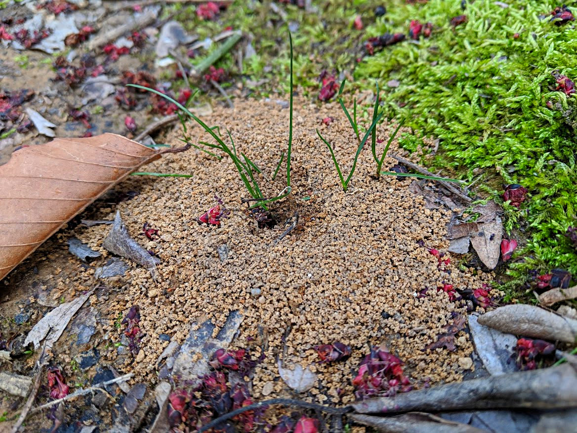 The ants in my neighborhood store away seeds for the winter. But, for some reason some of the seeds end up just outside their hole. I don't know if they get dropped on the way in or if the ants take them out of their nest when they are preparing for spring. So, along with the dirt they have dug out there are a number of grass seedlings growing.