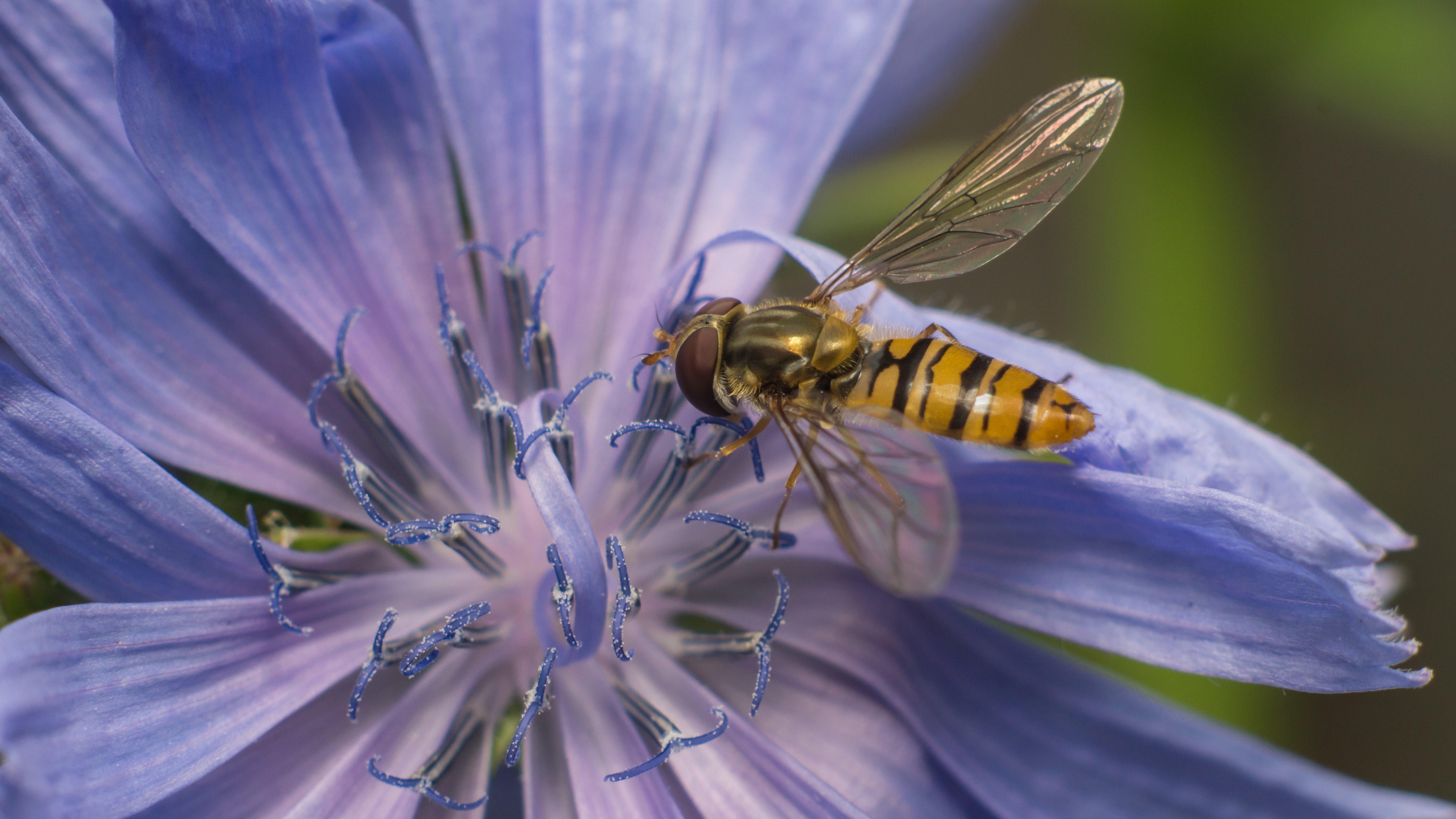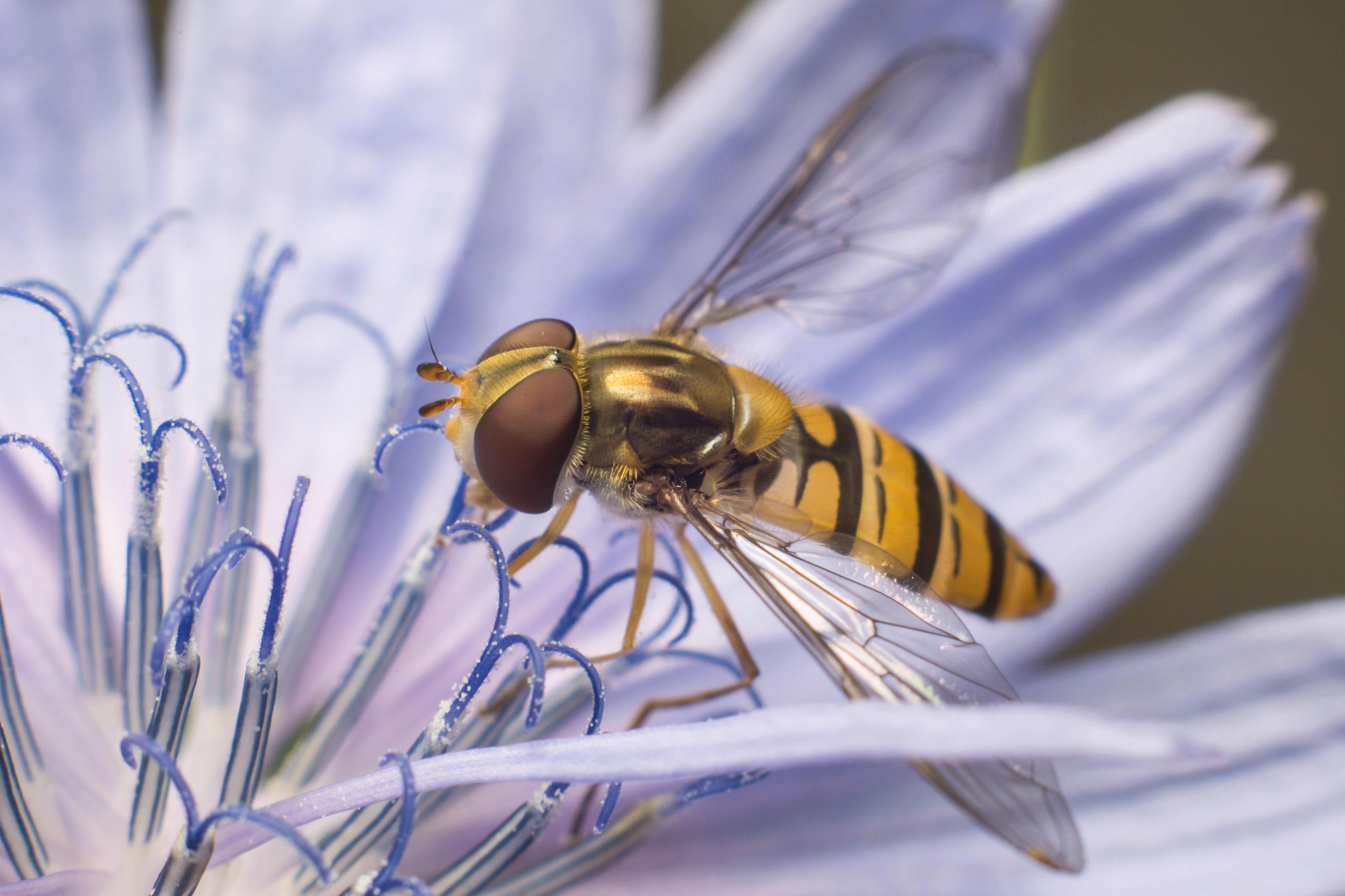 Marmalade fly on chicory flowersteemCreated with Sketch.stresskiller (61)in #macrophotography • 8 years ago Marmalade fly on a chicory flower posing for the photographer ;) #1 #2 #3 images created with the Sony A6000 camera + panagor auto macro converter + rokkor 50mm 1.7 #insects #flowers #nature #photography