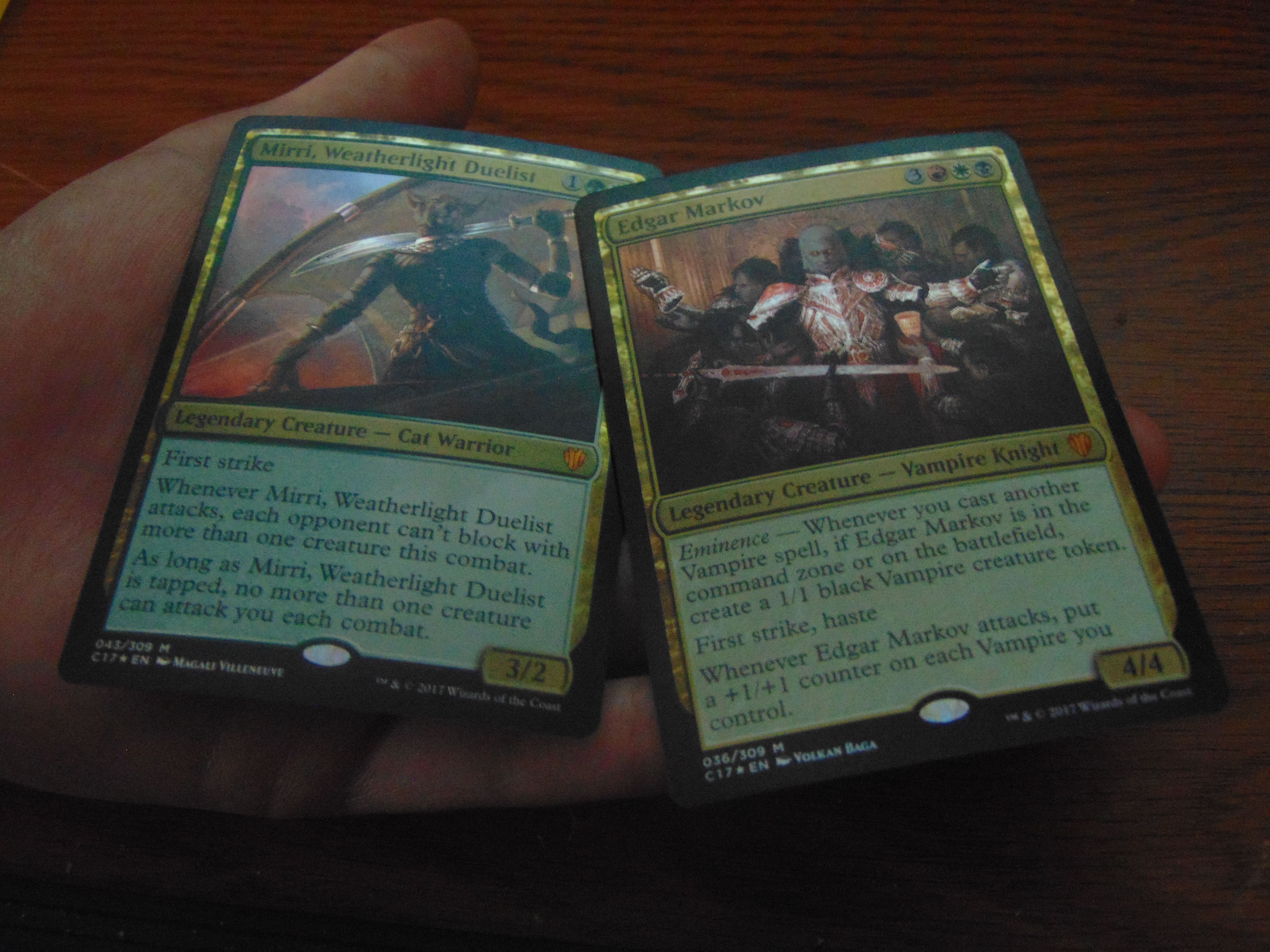Edgar then laid down dragonskull summit and then summoned the first creature of the game Tithe drinker with Edgar’s eminence he created a 1/1token vampire.Mirri laid down a forest and then played Fireshrieker. Edgar then played Rakish Heir and paid the extort cost to deal first blood. Edgar’s eminence took affect and created a second 1/1 Vampire token. Tithe drinker then attacked which dealt 3 damage to Mirri. Edgar now is in the lead with 43 life and Mirri at 37. Mirri then played sword of the animist.Edgar then cast swiftfoot boots and gifted aetherborn. Creating another vampire token. Tithe Drinker deals 4 combat damage. Mirri is down to 33 and Edgar has 47. Mirri laid down a plains and then she brought herself into the fray and then attached prowler’s helm,Sword of the animist, Fireshrieker to herself. Edgar then cast Malakir bloodwitch which created another token. Mirri lost 5 life due to an enter the battlefield affect. Mirri since she now couldn’t be blocked by any of the vampires took a large swing at the Vampires which dealt 10 damage. Edgar could do nothing. All hope had been lost. Mirri then attached dagger of worth to herself and spidersilk net and dealt the final blow.
