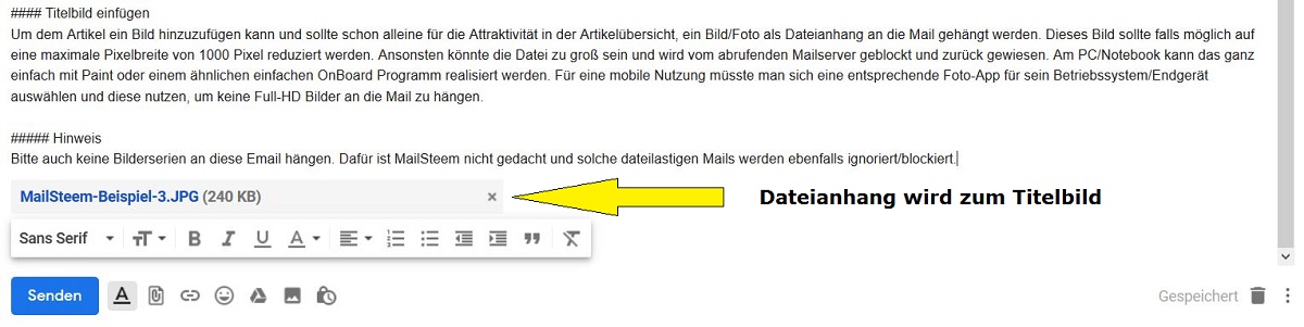 Um dem Artikel ein Bild hinzuzufügen kann und sollte schon alleine für die Attraktivität in der Artikelübersicht, ein Bild/Foto als Dateianhang an die Mail gehängt werden. Dieses Bild sollte falls möglich auf eine maximale Pixelbreite von 1000 Pixel reduziert werden. Ansonsten könnte die Datei zu groß sein und wird vom abrufenden Mailserver geblockt und zurück gewiesen. Am PC/Notebook kann das ganz einfach mit Paint oder einem ähnlichen einfachen OnBoard Programm realisiert werden. Für eine mobile Nutzung müsste man sich eine entsprechende Foto-App für sein Betriebssystem/Endgerät auswählen und diese nutzen, um keine Full-HD Bilder an die Mail zu hängen.