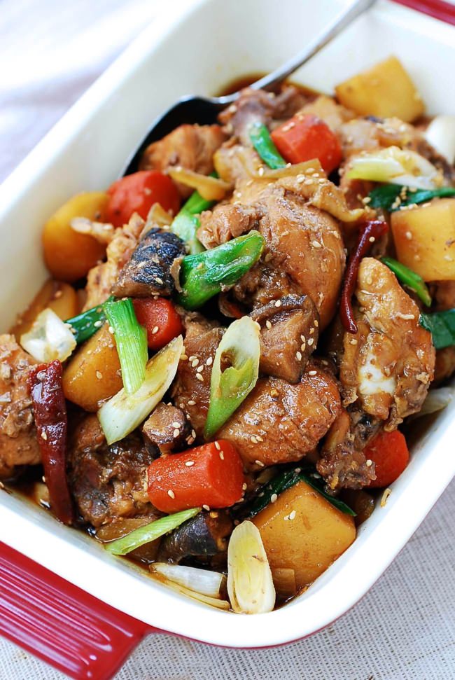 간장으로 한국식 닭고기 만드는 법 재료: 닭고기 1kg(1000g)을 적당한 크기로 썬다. 중간 크기의 감자 2개를 껍질을 벗기고 입방체로 자릅니다. 당근은 중간 크기의 입방체로 자릅니다. ½ 큰 양파, 얇게 썬 것 얇게 썬 버섯 4~5개 다진마늘 4~5개. 얇게 썬 신선한 생강 조각 3 - 4개 마른 고추 2개 파 2개는 얇게 썬다. 소스: 간장 ⅓컵(80ml). 황설탕 2테이블스푼(25g). 굴 소스 2큰술(25g). 쌀 식초 3테이블스푼(45ml). 꿀 2테이블스푼(25g). 갈은 후추 ¼티스푼(1.25g) 참기름 2작은술(10ml). 참깨 1티스푼(5g). 준비: 볼에 간장, 흑설탕, 굴소스, 식초, 꿀, 후추를 넣고 재료가 섞일 때까지 잘 저어준다. 큰 냄비에 닭고기, 감자, 당근, 양파, 버섯, 마늘, 생강, 카이엔페퍼를 넣고 중불에서 2분간 잘 저어줍니다. 간장 혼합물을 넣고 잘 섞은 다음 혼합물을 끓입니다. 냄비를 덮고 가끔 저어주면서 닭고기와 야채가 익을 때까지 약한 불에서 45~60분간 끓입니다. 참기름, 참기름, 파를 넣고 소스가 약간 걸쭉해지고 파가 시들 때까지 중불에서 5분간 닭고기를 둔다. 닭고기를 서빙 접시에 담고 뜨거운 밥과 함께 제공합니다.