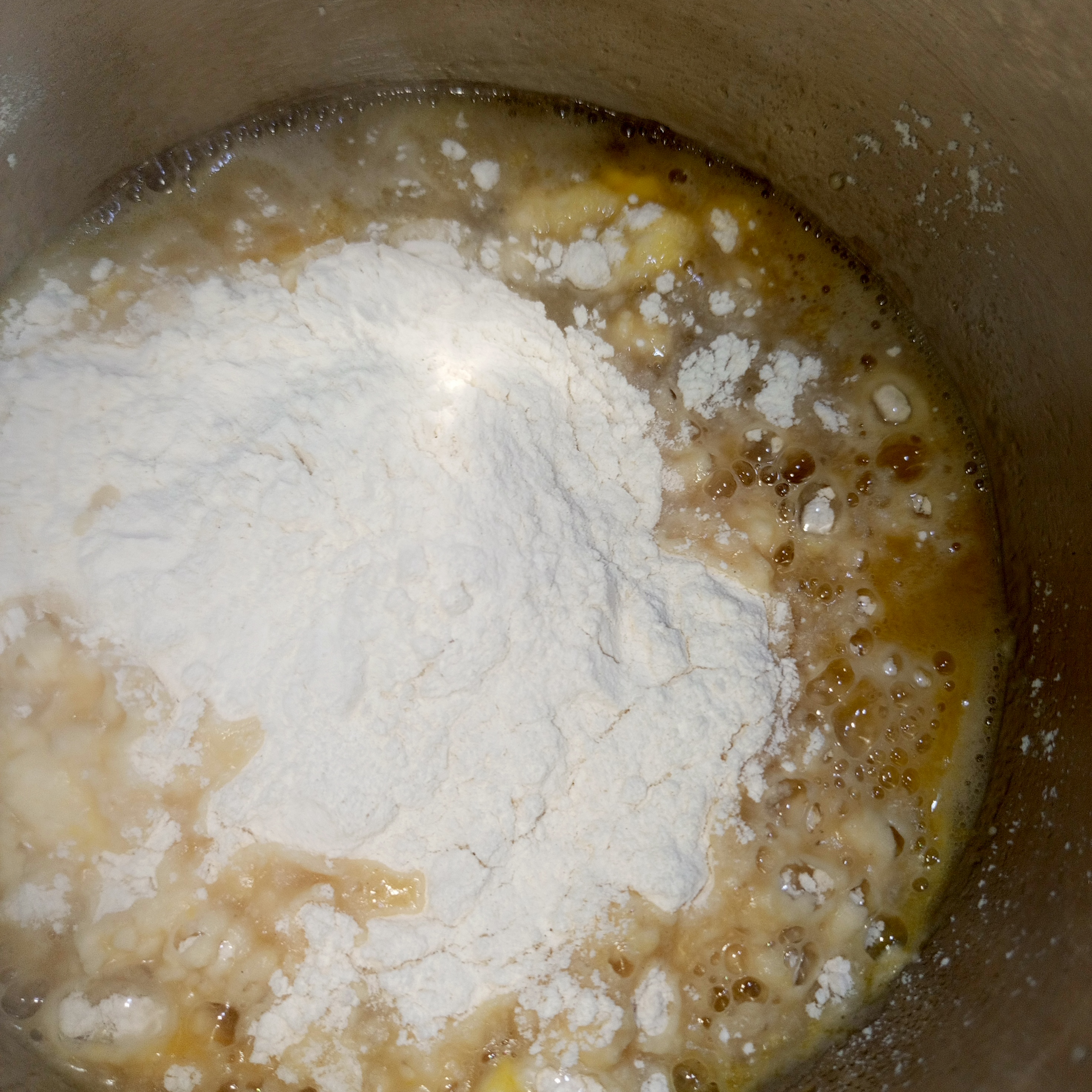 En una olla puse a hervir el agua con la vainilla y la mantequilla, una vez que estaba todo derretido, agregué la harina de un solo momento y empecé a revolver fuerte para evitar grumos y que quede todo muy bien compacto.
