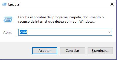Abrir Simbolos de Sistema o presionamos la tecla winsdows + R = (Ejecutar) Una vez ya en ejecutar buscan CMD