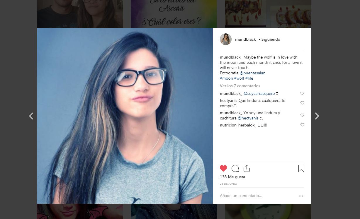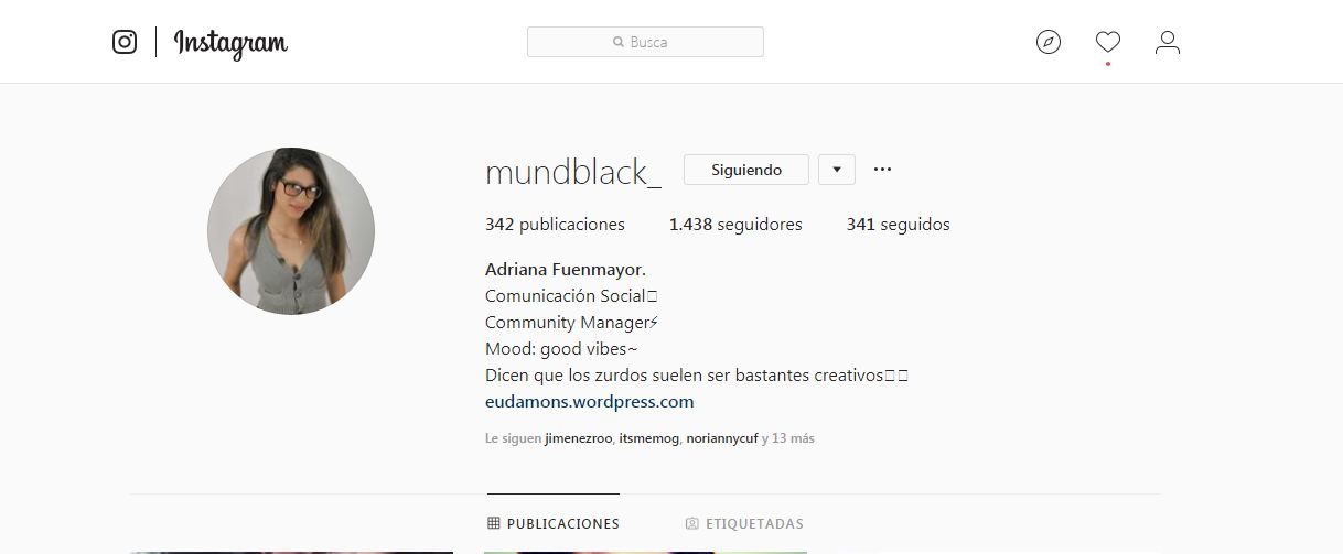 Para encontrar mi página utilizo el siguiente username @mundblack_ lo números que indican 1.438 es la cantidad de seguidores que poseo, y 341 es la cantidad que yo sigo, seguido de ello está mi nombre real y luego mi biografía así los seguidores concerán un poco más de mi y de mis cualidades o logros. En el botón de link es de un blog personal en donde también escribo.
