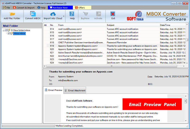 The software shows a live preview of each mbox folder, Before moving emails from MBOX files to Office 365.