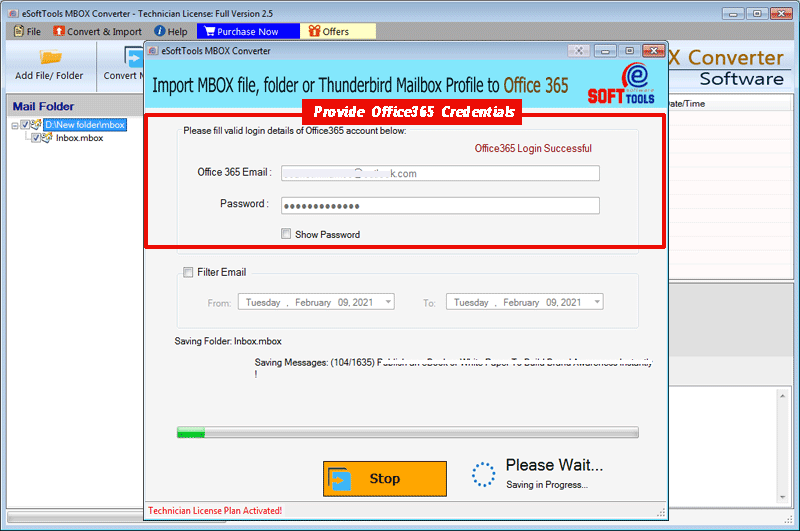To begin importing MBOX file emails to Office 365, enter your Office 365 account information and click the convert button.