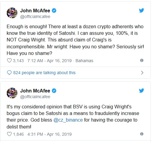“It's my considered opinion that BSV is using Craig Wright's bogus claim to be Satoshi as a means to fraudulently increase their price,” McAfee added. “God bless @cz_binance for having the courage to delist them!”