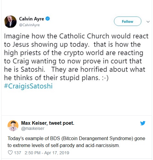 McAfee went on to call Wright and his supporters “frauds” and BSV a “scam.” Renegade economist Max Keiser echoed McAfee’s thoughts, accusing entrepreneur Calvin Ayre of “Bitcoin Derangement Syndrome” for sticking by the ‘Wright-is-Satoshi’ theory.