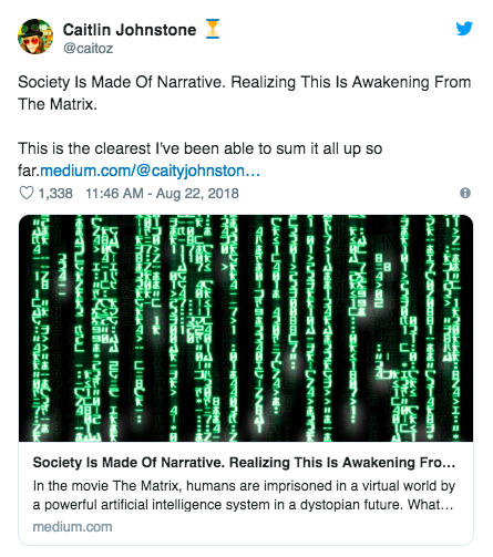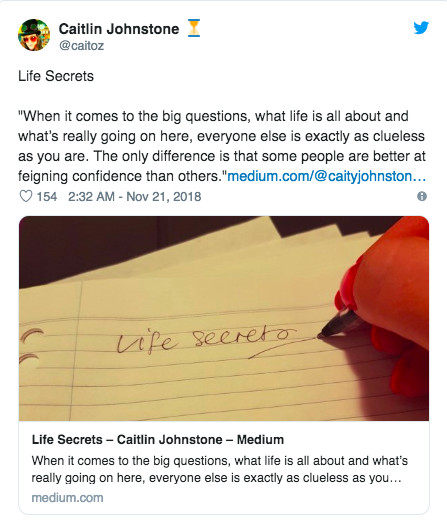 The best way to get around the internet censors and make sure you see the stuff I publish is to subscribe to the mailing list for my website, which will get you an email notification for everything I publish. My articles are entirely reader-supported, so if you enjoyed this piece please consider sharing it around, liking me on Facebook, following my antics on Twitter, throwing some money into my hat on Patreon or Paypal, purchasing some of my sweet new merchandise, buying my new book Rogue Nation: Psychonautical Adventures With Caitlin Johnstone, or my previous book Woke: A Field Guide for Utopia Preppers.