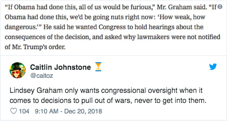 Endless war and military expansionism has become so normalized in establishment thought that even a slight scale-down is treated as something abnormal and shocking. The talking heads of the corporate state media had been almost entirely ignoring the buildup of US troops in Syria and the operations they've been carrying out there, but as soon as the possibility of those troops leaving emerged, all the alarm bells started ringing. Endless war was considered so normal that nobody ever talked about it, then Trump tweeted he's bringing the troops home, and now every armchair liberal in America who had no idea what a Kurd was until five minutes ago is suddenly an expert on Erdoğan and the YPG. Lindsey Graham, who has never met an unaccountable US military occupation he didn't like, is now suddenly cheerleading for congressional oversight: not for sending troops into wars, but for pulling them out.