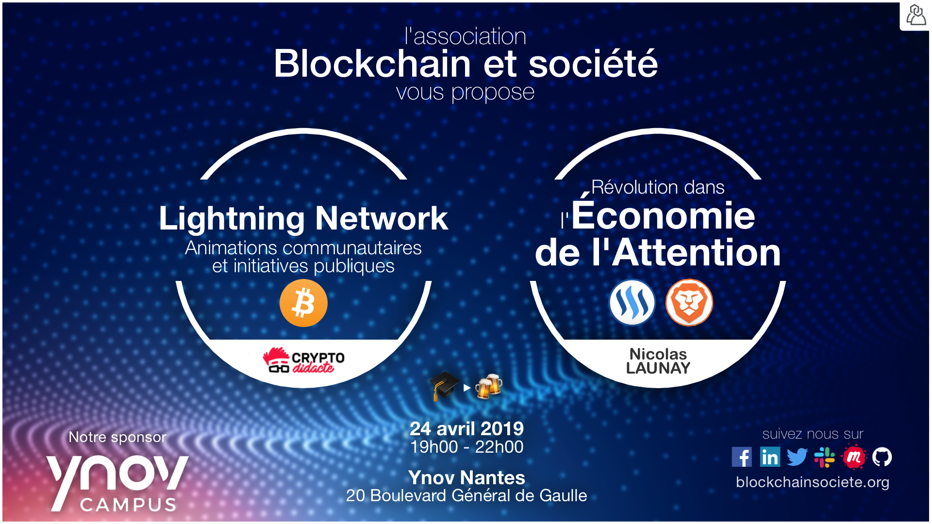 Blockchain et Société : Meetup du 24/04/2019otter.jack (25)in #meetup • 7 years ago Venez vous joindre à nous à l'occasion du 4ème meetup de l'année à YNOV ce soir Mercredi 24 Avril. Les sujets prévus sont : Le lightning network présenté par cryptoditacte. La blockchain et l'économie de l'attention présenté par mes soins #lightning #network #steem #brave