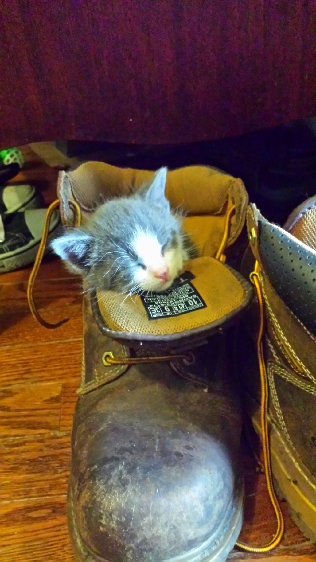 This is my cat Thor, last year...When he was tiny. I thought I lost him😲but he was in my work boot phew. turned out cute. ❤