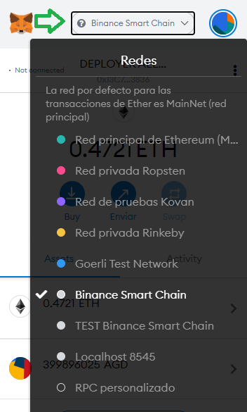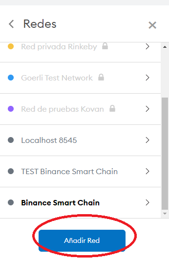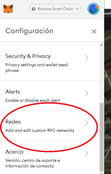 Luego hacemos click en la sección de redes para ingresar la Blockchain de Binance