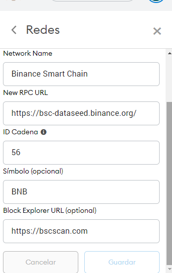 Ahora es tiempo de configurar la RED de BINANCE SMART CHAIN (BSC)