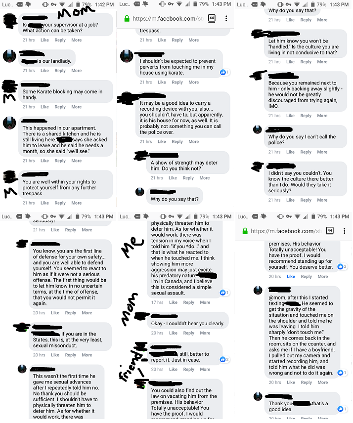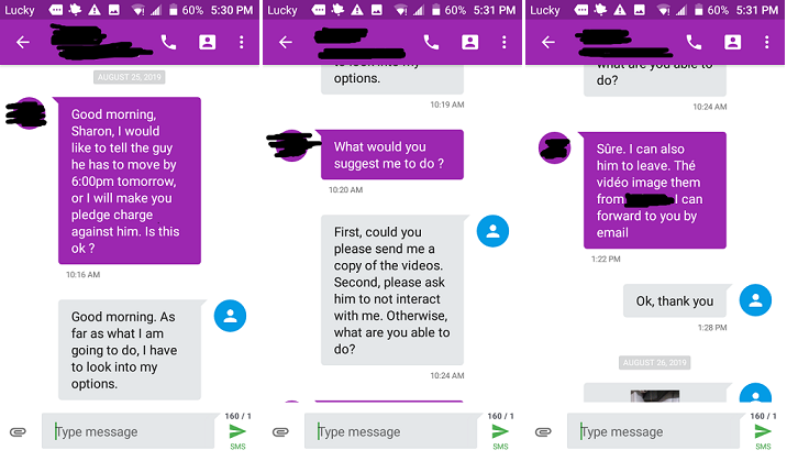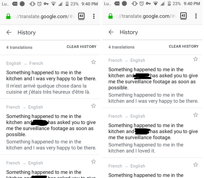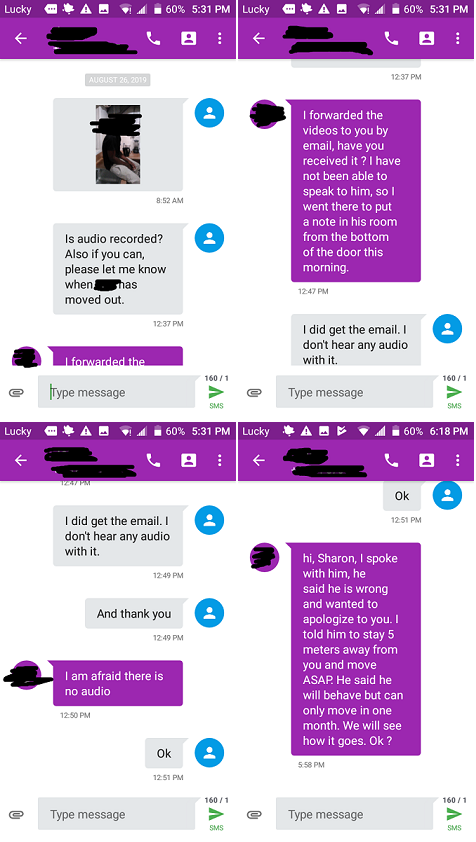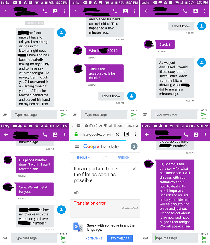 I said I guess you will find out what will happen. I texted Claire. Jase kept leaning trying to see what I was typing. I told her what happened and she called me but I couldn't pick up. I called her back. Before she called me she asked who Jase is. Jase at the end of my first text said he was leaving. He touched me on the shoulder and I said "Don't touch me." Then he came back in and sat on the counter, asking if I had a boyfriend. I pulled out my camera and started recording. I told him what he did was wrong. He shouldn't have touched me, and not to harass me with requests for sex. He said he was a good boy and he wouldn't. I stopped recording. He asked if I was going to call the cops. Claire asked who Jase was, so I took his picture and sent it in the text. Then she called me and said he wasn't allowed to sit on the counter. It was a little hard to understand her. She was asking if I thought it was okay for her to call him and tell him not to do that? I went outside where I could hear her better and asked for a copy of the surveillance video. She said I would have to ask Easton. I texted her the request as well and got Easton. He doesn't understand English, so I had to rely on Google translate. I typed that something happened in the kitchen and I need the surveillance video. It "autocorrected" to "something happened in the kitchen and I loved it." I fixed it and took a screenshot of the history of the translations.