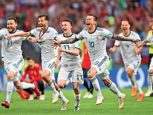 On penalties Russia beats spain by 4-3 after a draw of 1-1 to reach the quarter finals . the penalties leads Russia to quarter finals . there is an opportunity for Russia .