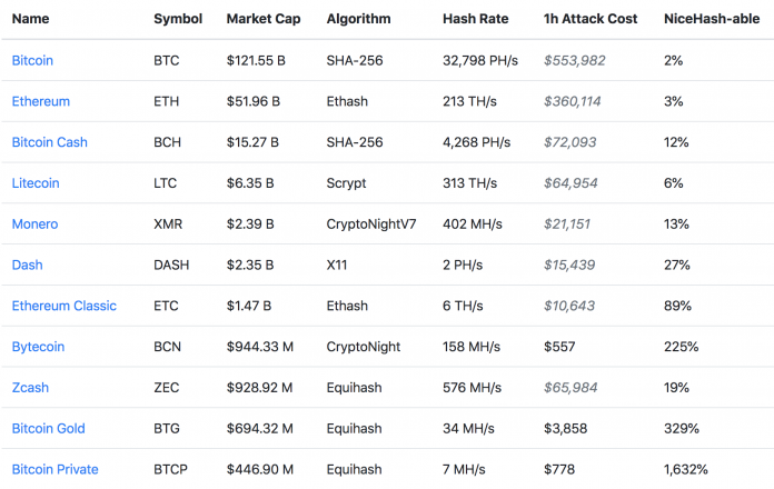 Cost to do a 51% attack on some cryptocurrencies.