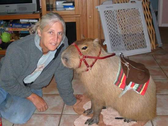 Friends'This animal called Capbara is actually a guinea pig.It is also considered to be the biggest rat.It's 4 feet long and his weight is 15kg.It is very ricky to keep such dangerous animals as pets. This big rat named Caplin Rous have the unusual reputation on the Internet.His mistress named Melini Hablados says that he wants to make awareness of people by adopting these big mice.Hablados says that this animal is completely a domestic animal. It says that if you have to keep this animal as a pet, then you have one,So you have to have a baby.