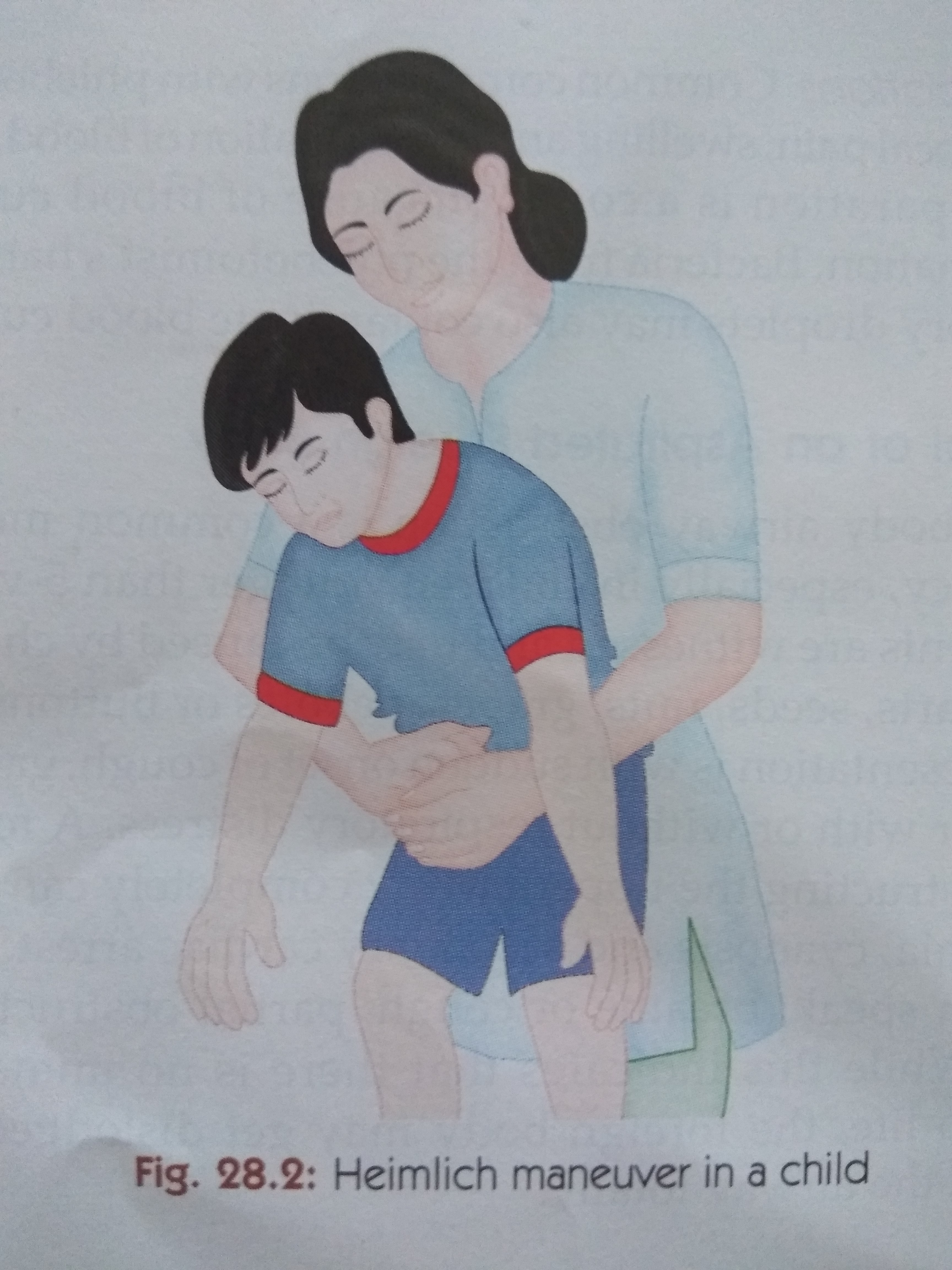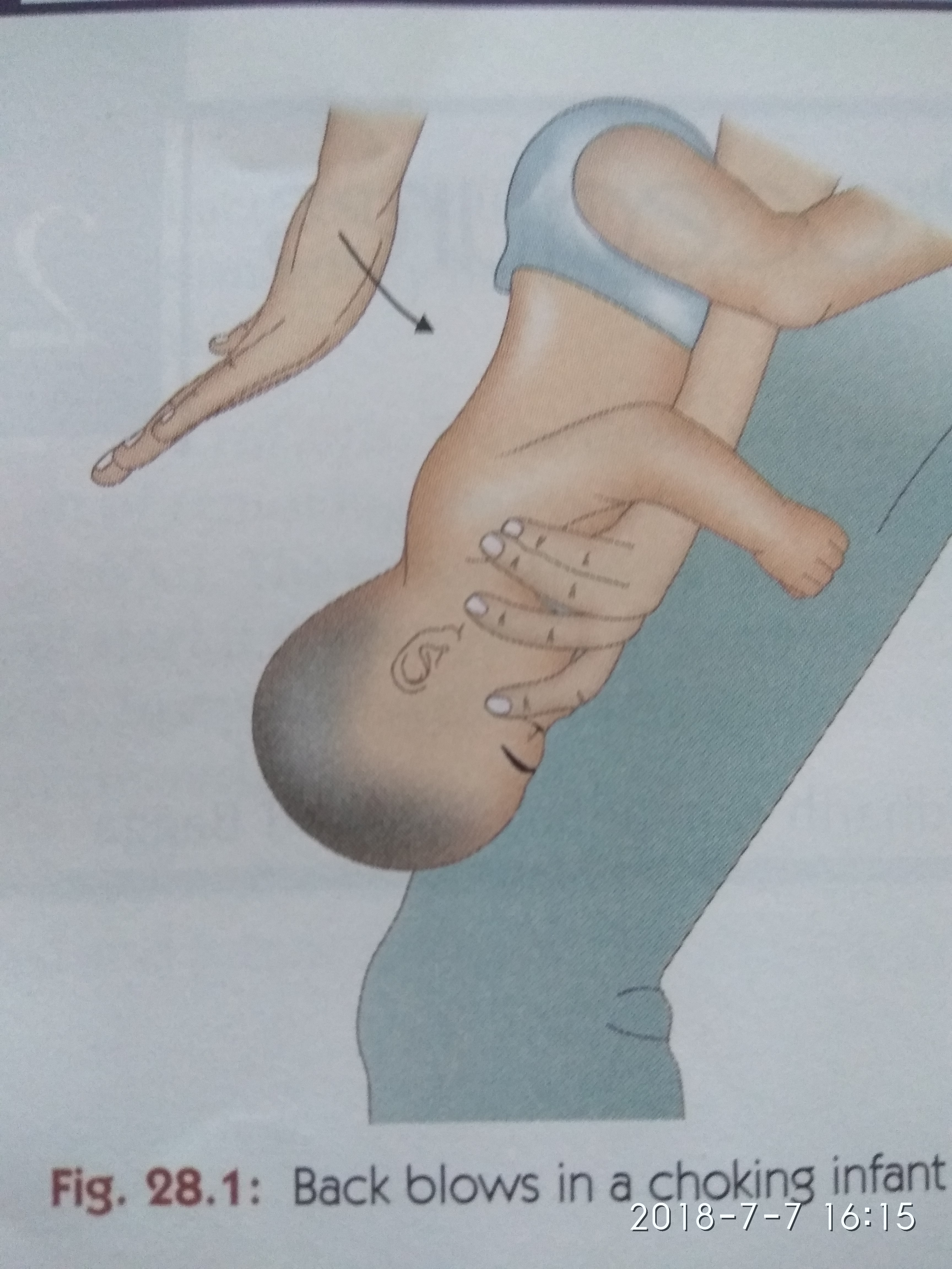 A choking infant younger than 1 year is placed face down over the rescuer's arm,with the head positioned below the trunk.Five controlled back blows should be given rapidly between the scapula with the heel of hand.If the obstruction persist,child is rolled over and five chest compressions are given and again the back blows repeated until patient gets relieved.