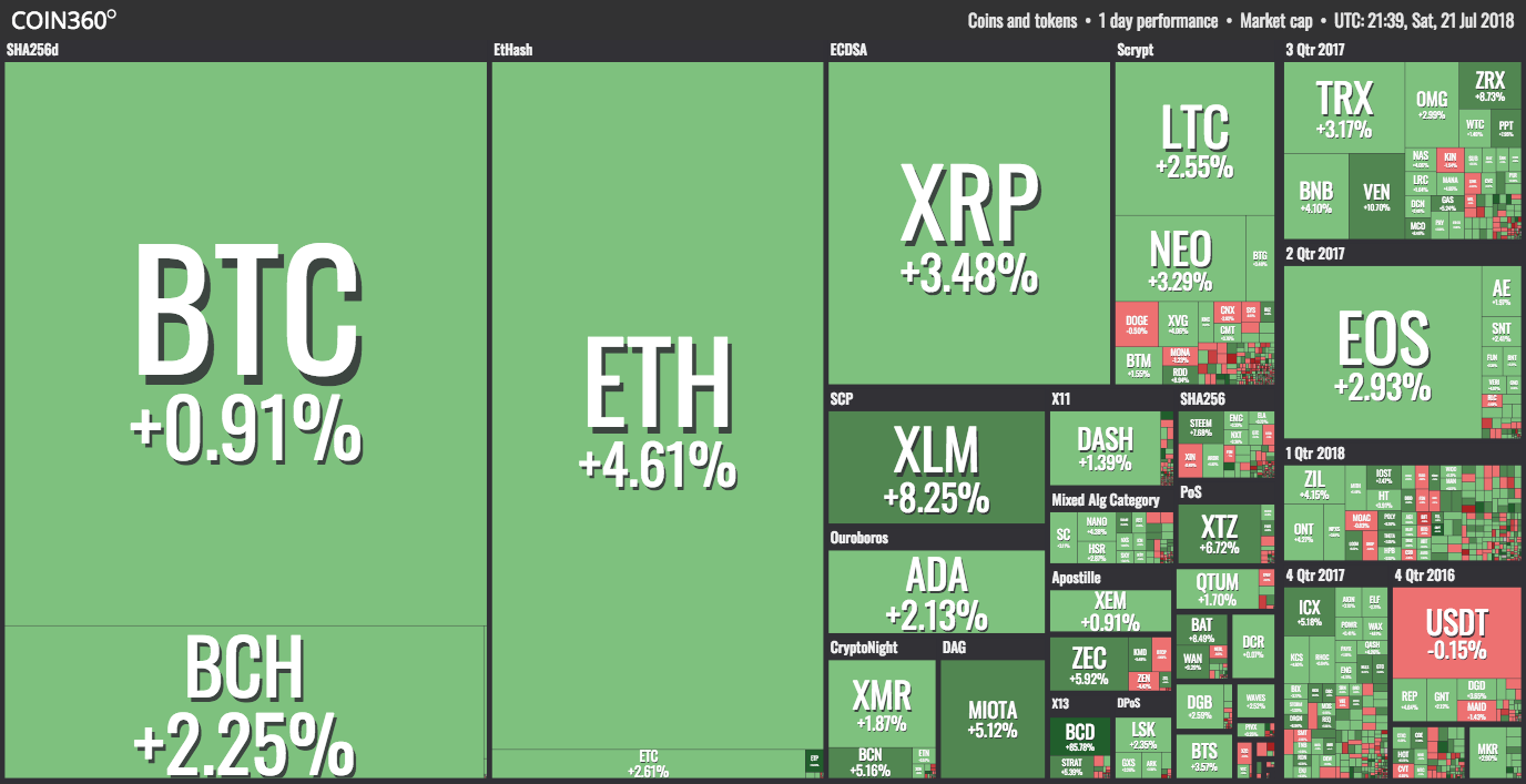crypot markets are seeing mostly green today july 21, continuing the momentum of this weeeks upswing the top ten allcoins are solidly regaining today up as much 8p percent accordig to coin360 with bitcoin (BTC) only slightly in the green hovering near yesterday s levels.