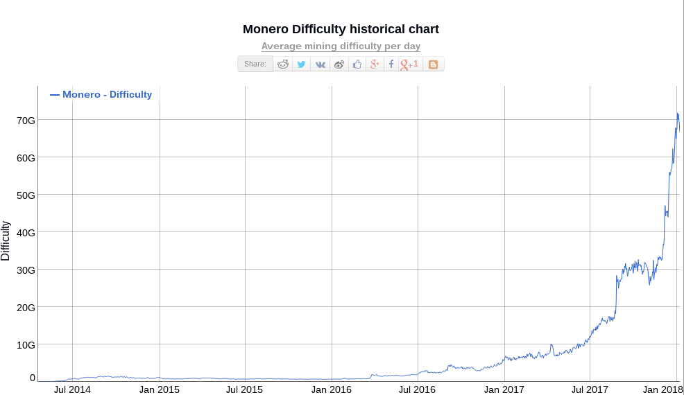 For those who’re new to mining, this chart depicts the rate at which you’ll be granted rewards in accordance with the amount of energy spent by your GPU to mine. From an economic standpoint, this chart can be thought of as representing your GPU’s “buying power”. As we can see, the same amount of energy would’ve returned far higher rewards since Monero’s creation all the way up until the summer of 2017, at which point the difficulty adjusted drastically, resulting in more energy being required to see the same kind of returns.