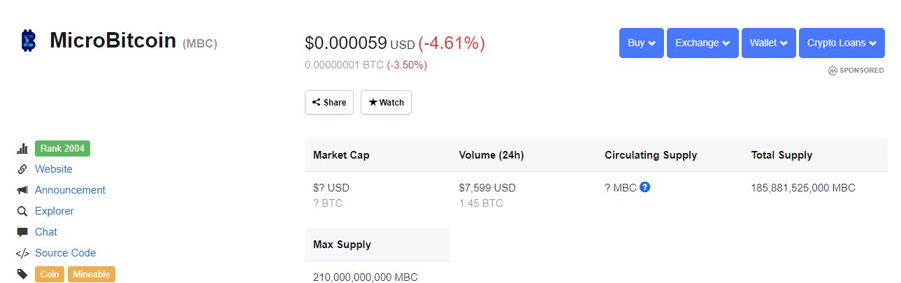 MicroBitcoin down 4.61% on coinmarketcap 04/30/2019steemCreated with Sketch.microbitcoin (34)in #microbitcoin • 7 years ago Microbitcoin (MBC) down 4.61% to 0.000059 volume $7,599 USD 1 satoshi total supply 185,881,525,000 max supply 210,000,000,000 #coinmarketcap #volume #satoshi #supply