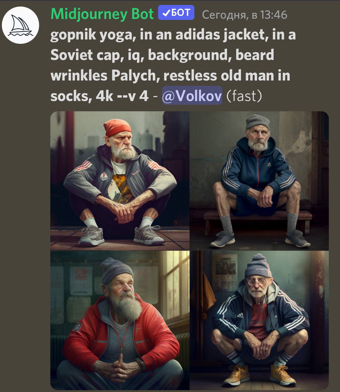 Midjourney vs Stable Diffusion Old Gopnik YogassteemCreated with Sketch.mashkovpro (54)in #midjourney • 3 years ago Promt Midjourney : Promt Stable Diffusion : gopnik yoga, in an adidas jacket, in a Soviet cap, iq, background, beard wrinkles Palych, restless old man in socks, 4k #ai #stablediffusion #art