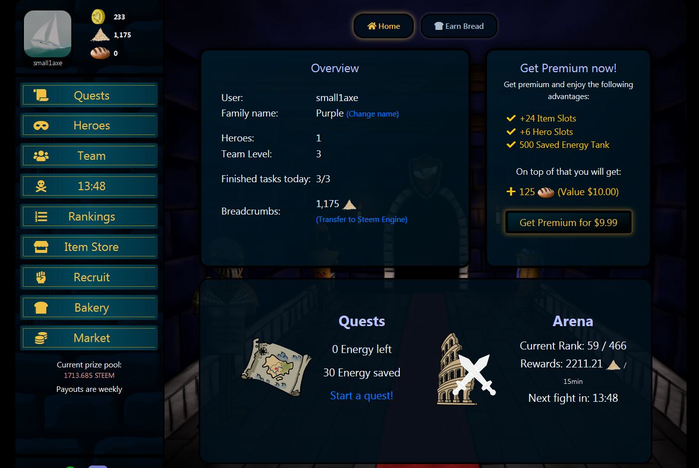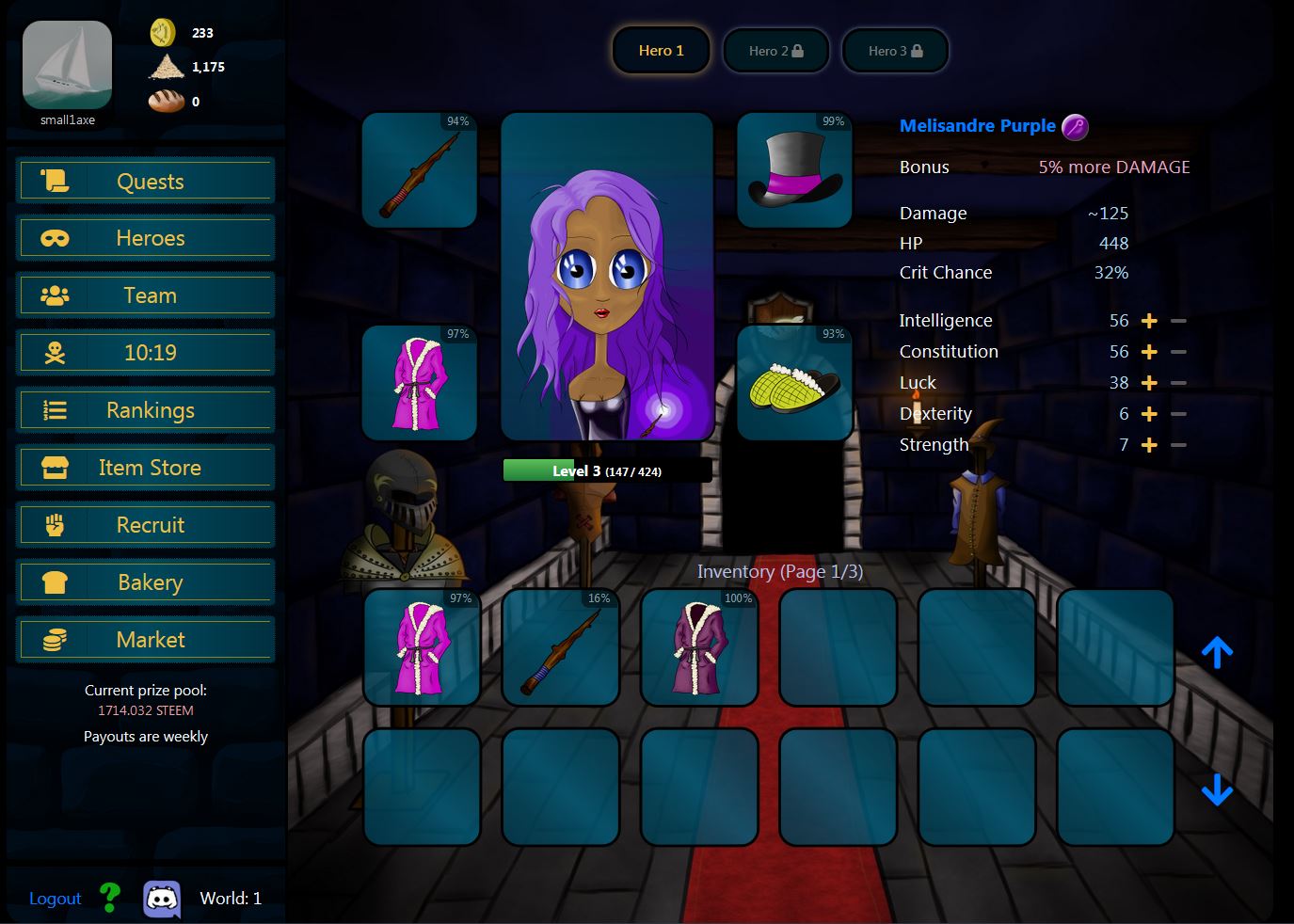 I am not gonna bother with any explaining or boring tutorial on this new game , still learning myself how to . What ever a breadcrumb has for a value is not clear to me to , as $10 will buy one 125 bread . witch can be used to save time to do more guests and battles for gold . Gold upgrades the hero's and can buy new ones , breadcrumbs can only transfer true steem engine and have no use in game . Until now it's fun to play , takes time , waiting time , see right down corner of above picture . Leveling up a Hero is not complicated if you use some logic ,.. did i , ...meh , i got lucky i guess . What does this do ,... woooo , oeps ... try again .