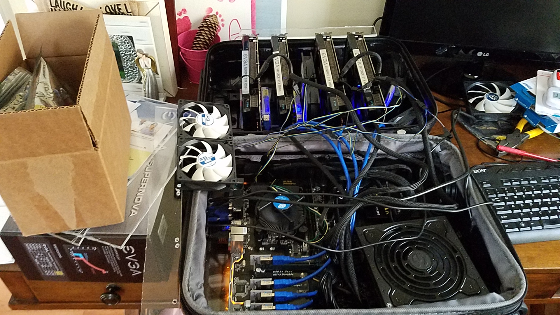 It is a basic system with 4 1050ti FTW GPU, Gigabyte MB, 550PSU, 64gb SSD, and 4gb DDSR. I built the frame out of acrylic to keep heat absorption to a minimum. I have (4) 92mm fans cooling it at the moment.