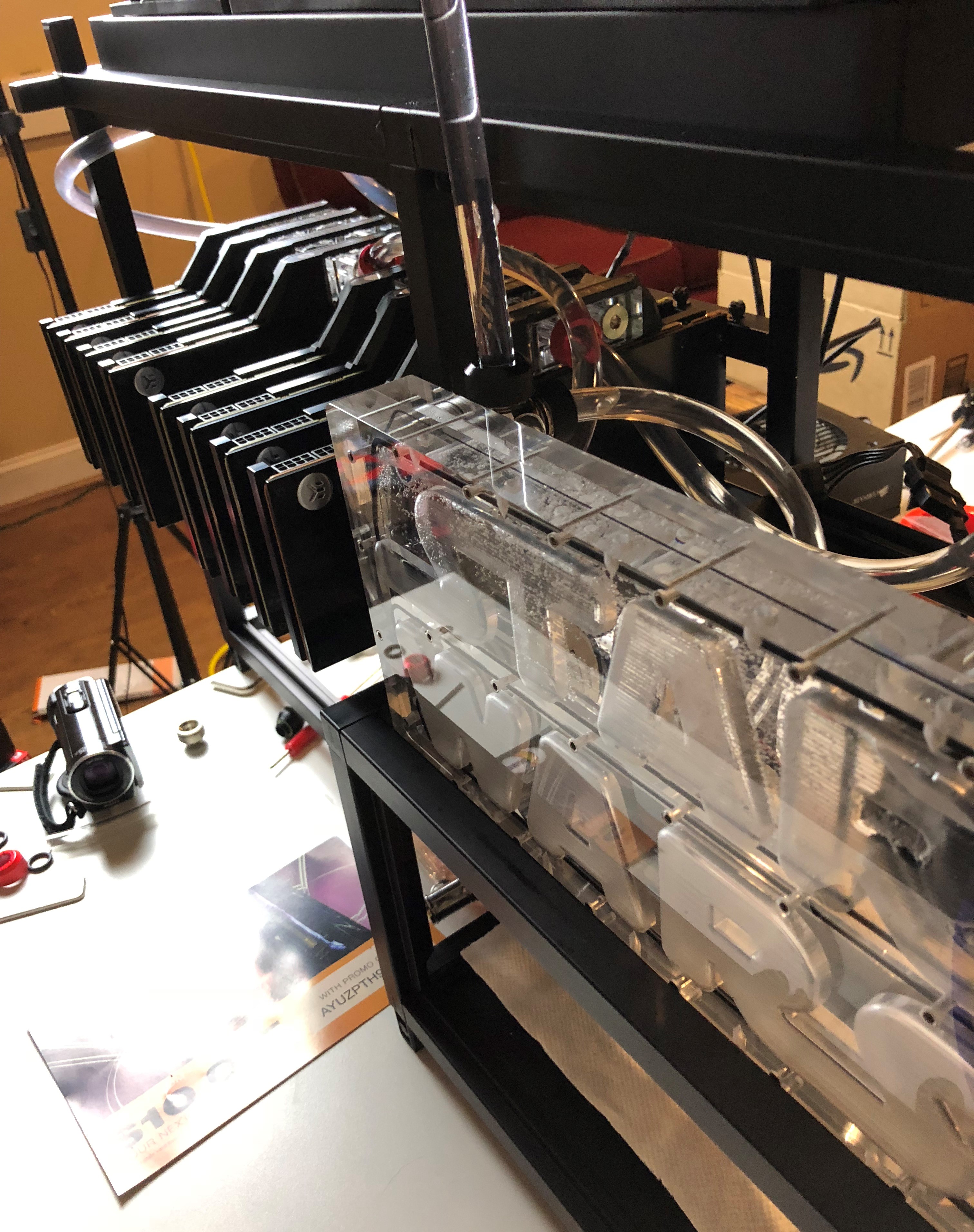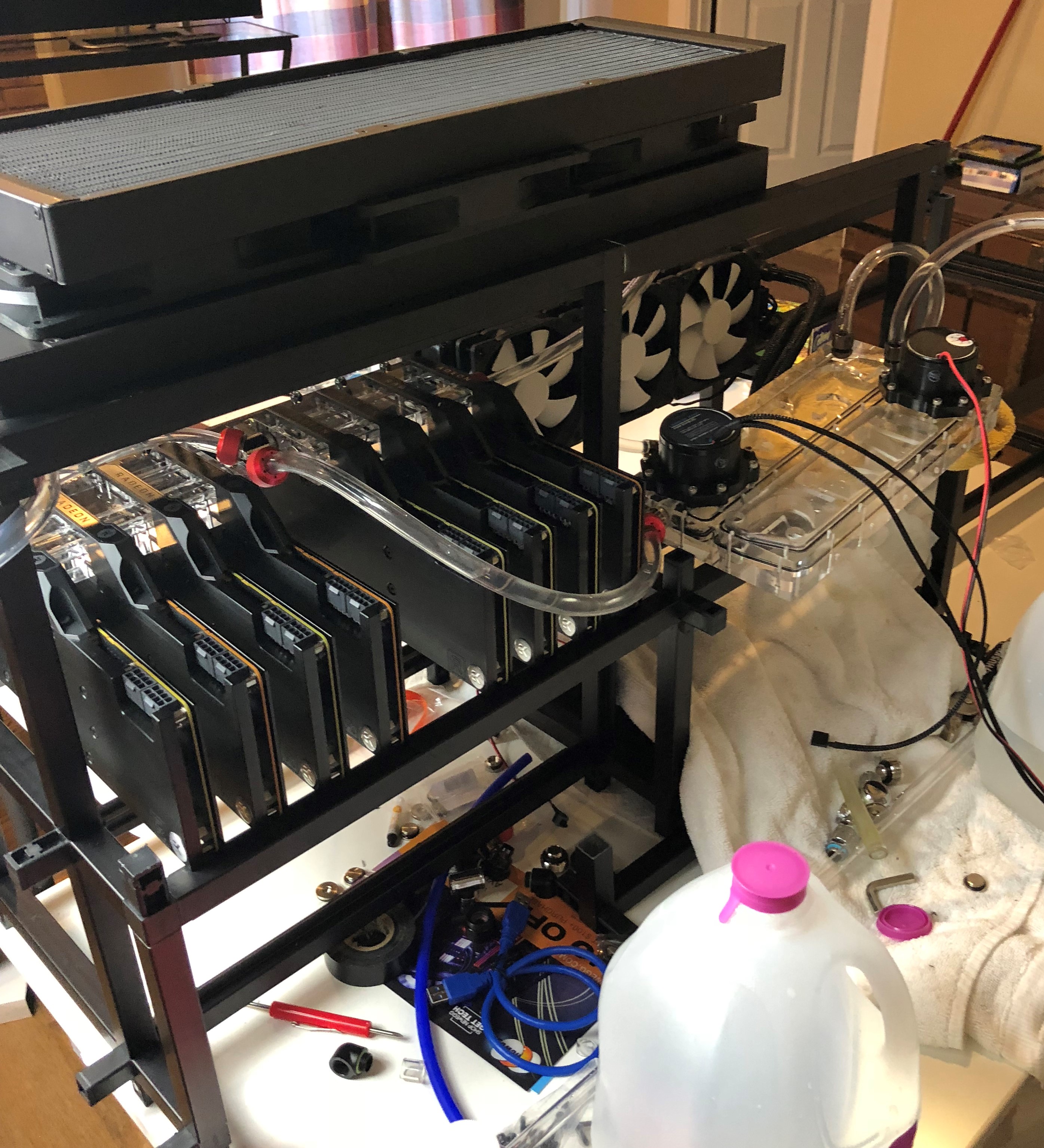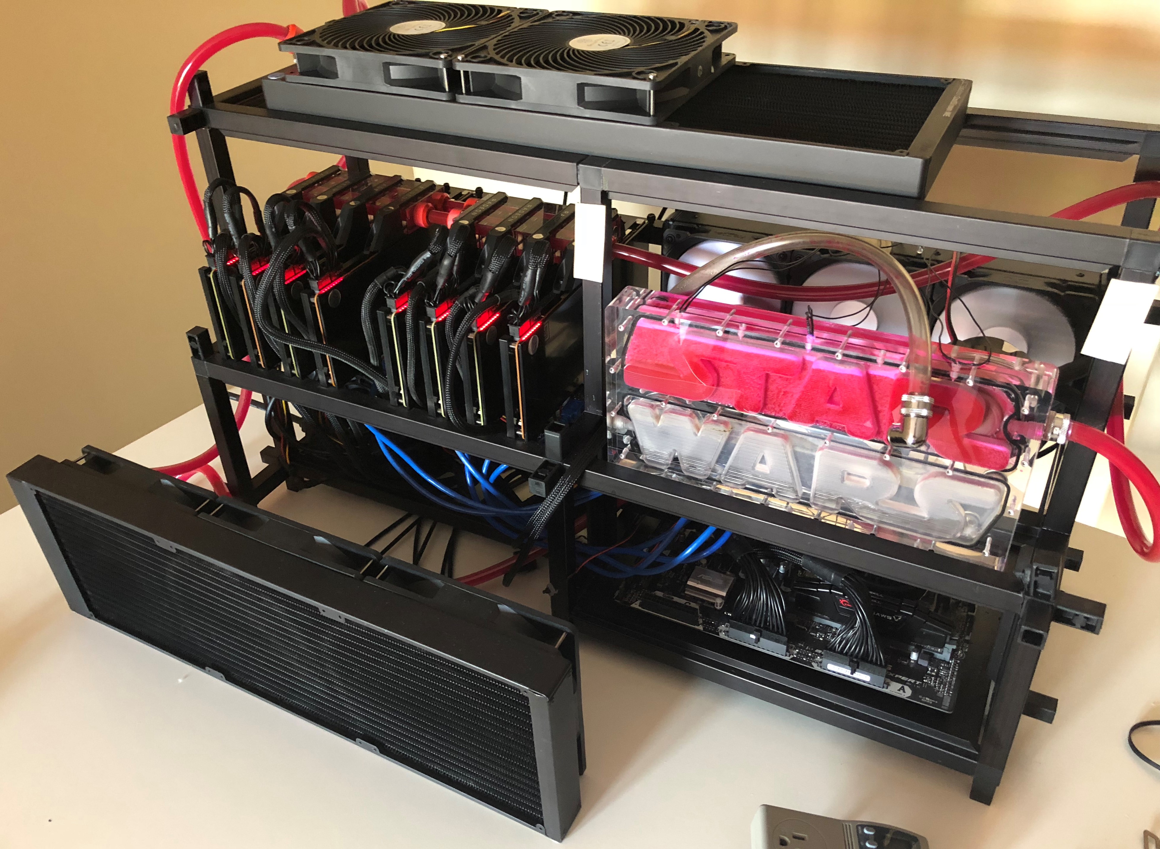 I've just now got the time to write up a post on this epic crypto rig I built last fall. I intended to publish a video but am a little too lazy to edit the footage so maybe I'll make one for phase 2. Version 1 was built in Dec 2017 - just in time to ride the massive price surge and it ROI'd in only 3 months, despite the additional cost for the liquid cooling parts.