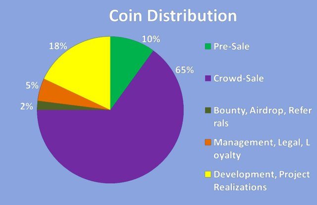 The developer plans to issue a total of 1 billion coins, with only 60% being available for public sale. The remaining coins with an initial value of $ 0.1 are distributed as follows (see figure).