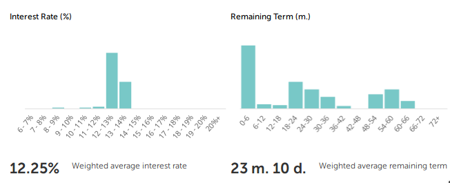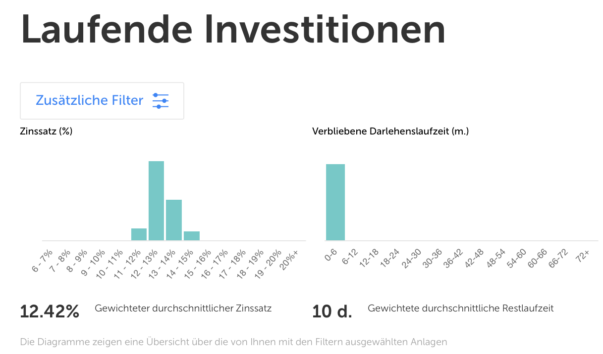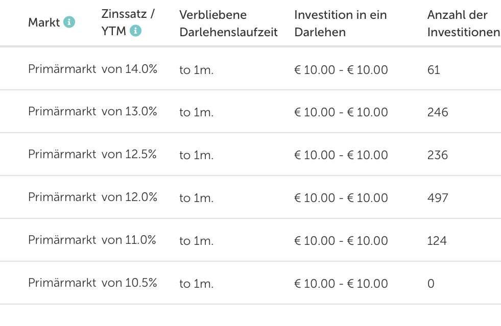 Ganz so schlimm sieht es diesmal nicht aus. Aber noch vor einigen Wochen konnte man mit etwas Glück durchaus Kredite mit 13,5% ergattern, die gerade nach der letzten Niedrigzinsphase sehr vielversprechend aussahen. Gerade bei den Kurzläufern ist es mir stellenweise geglückt mehr 13%-Kredite zu halten als darunter. Doch aktuell sieht es wieder etwas anders aus:
