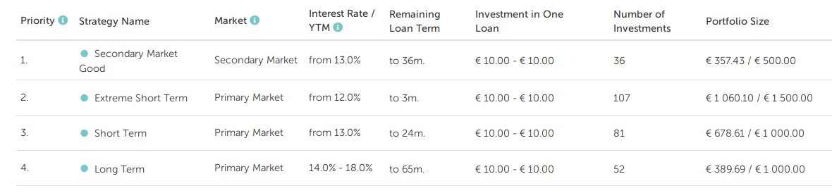 Das Autoinvest für den Zweitmarkt steht momentan aber auf 13%, da ich dort bis zu 36 Monate kaufen möchte. Daher sehe ich mir die Kredite vorher immer etwas an, bevor ich dann vielleicht doch zuschlage. Sinn könnte es hier auch machen weitere Strategien einzustellen, aber das fragmentiert das Portfolio dann doch noch weiter. Bevor ich mir die Arbeit mache, warte ich aber lieber noch ein paar Wochen ab. Traditionell steigt der Kreditbedarf zum Frühjahr ja immer etwas an.